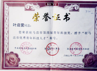叶启营,男,出生于1965年5月,汉族,高中文化程度,中共党员,农艺师,本单位中心主任,住河南省正阳县真阳镇乐堂村,于1993年起步研究繁育示范推广红薯品种,并于1994年成功的研究培育出红薯新品种一“梅营一号”(取研究人员武喜梅,叶启营名字的最后一字命名),相继研究培育出“梅营七号”等系列新品种。他曾先后被评为河南省“优秀民营企业家”、省“十杰乡土拔尖人才”、省“十大种植状元”、省“科普先进工作者”、省“优秀青年农民”、市“乡士拔尖人才”、“劳动模范”、“优秀科技人才”、“十大杰出青年”等荣誉称号。